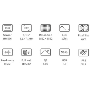 This camera is equipped with a modern 1.6" sensor with 3552*3552 Pixels. In addition to modern Starvis 2 technology (with back illumination), the IMX676 offers an extremely smooth image without amplifier glow – but its most impressive features are its very high resolution of 2.0 µm Pixels and its relatively high frame rate. This makes the camera particularly suitable for the following applications: