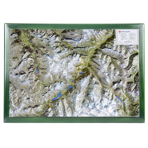 Genuine 3D relief map of the Upper Engadine with relief shading and coloured elevation layers derived from high-resolution terrain models. An attempt has been made to graphically reproduce the detail of an aerial photograph for the viewer.