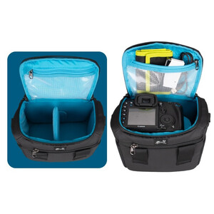 This shoulder bag offers space for a system camera or compact DSLR camera with a standard lens and a flash or a second lens.