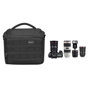 This large shoulder bag offers space for a system camera or DSLR camera with multiple lenses and a flash or a second body. Telephoto lenses up to 70-200mm f/2.8.