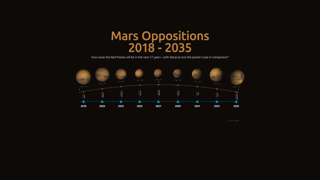 On the 27th of July, 2018, the time will finally be upon us: our neighbor, Mars, will stand in opposition to the Sun.  Such an event happens every two years, but this time around is something much more special.  The last time Mars was so close to Earth, during opposition, was back in 2003.  This year, the red planet will come within 57 million kilometers, which is about the same distance as 15 years before.  Mars will appear to be about half of the size of Jupiter, something only rarely observable, but with numerous details.
