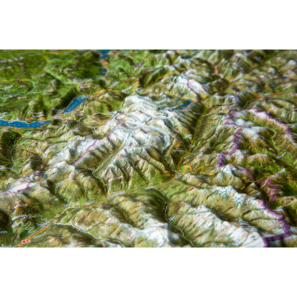 Orthophotoreliefs are 3D relief maps printed with aerial photographs (orthophotos). These can mainly be used in scale ranges between 1:10,000 and 1:500,000. Relief shading and coloured elevation layers make the relief particularly clear on these maps.