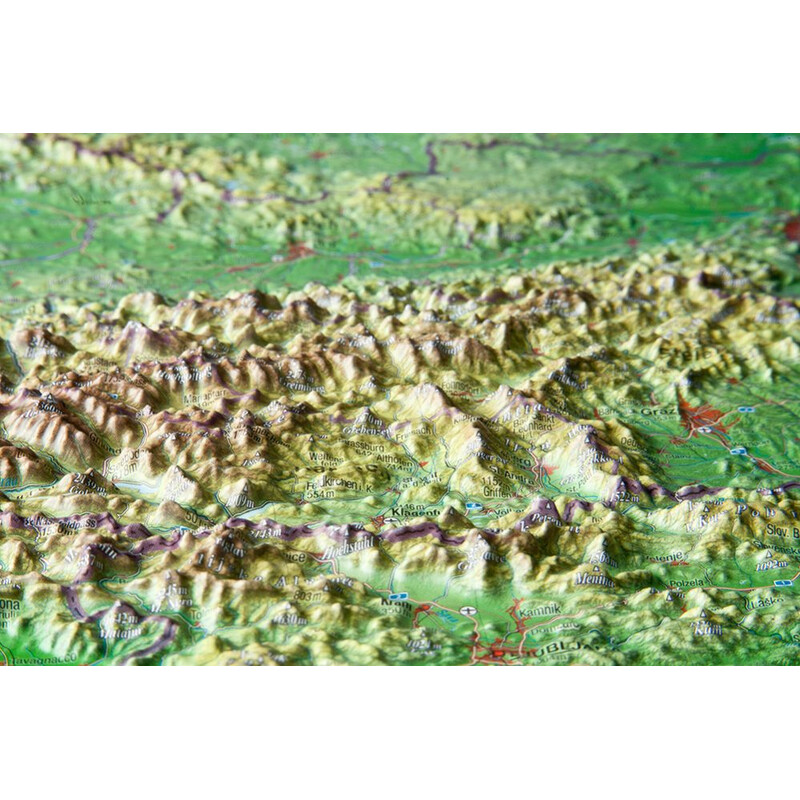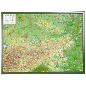 Genuine 3D relief map of Austria with relief shading and coloured elevation layers derived from high-resolution terrain models. An attempt has been made to graphically reproduce the detail of an aerial photograph for the viewer.