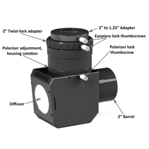 With the Herschel wedge, solar observation in white light is particularly safe. This is ensured by the integrated, multi-coated ND3 filter and the ceramic plate at the lower end. Solar observation with the Herschel wedge is also particularly easy: you only need to insert the Herschel wedge into the telescope like a diagonal mirrors. The built-in variable polarisation filter allows you to adjust the brightness.