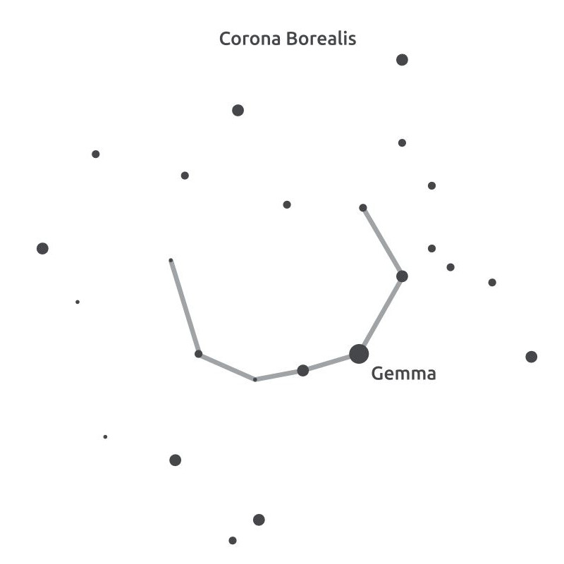 SPECIAL PRINT The constellation Northern Crown (lat Corona Borealis) is much older than the coronavirus. The small but distinctive constellation in the friendly smiley form was already mentioned by Claudius Ptolemy in ancient times. In Greek mythology the constellation symbolized the crown of Ariadne, daughter of King Minos of Crete.The brightest star in the crown is appropriately called Gemma, Latin for jewel. As an Algol-type eclipsing binary, Gemma also particularly interesting in astrophysical terms!