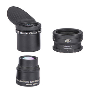 The triplet-lens Hyperion-Barlow is designed to compensate for the short focal length of spotting scopes. The lens set works as field flattener and provides perfect sharpness to the edge of field. The 6 mm eyepiece can be detached from the barlow lens set and mounted onto the spotting scope with the supplied Baader-Diascope-Bayonet.