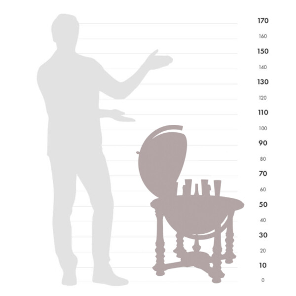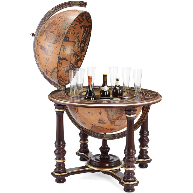 The prestigious Demetra Globe Bar is one of the finest of the entire Zoffoli Collection. It has a 60 centimetres diameter that grants a great space for storing your bar accessories and your bottles. The load-bearing structure is made of beech wood shaped by hand. The sphere brings back a faithful 16th Century cartography’s replica. In the inside, you can place up to 6 or 8 bottles and 16 glasses.