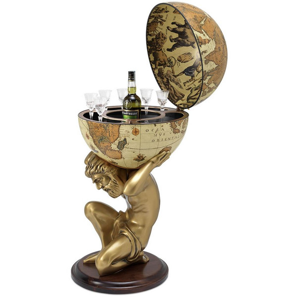 Inspired by the greek mythology, Zoffoli designed this extraordinary bar globe in form of an Atlas statue. The figure of ca. 60cm height holds an elaboratly decorated globe. The elegant wooden base takes care for a stable, solid stand. Inside there is enough space for 2-3 bottles and up to 9 glasses!