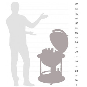 The hinged globe contains a spacious beverage compartment for around 4 bottles and 12 glasses. Additional bottles can be stored on the lower shelf, which is decorated with natural water-based paints. Open or closed, the globe rotates around its meridian. Thanks to castors, the globe can be moved easily.