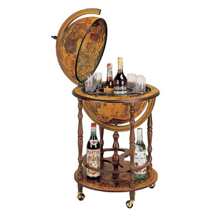 Standing bar globe with wonderful illustrations of sea monsters, sirens and mythological figures on the map. The Regolo globe has an interior drinks compartment with space for 2-3 low bottles and about 9 glasses. Additional bottles can be stored on the lower shelf, which is decorated with a compass rose that matches the zodiac sign around the globe's equator.