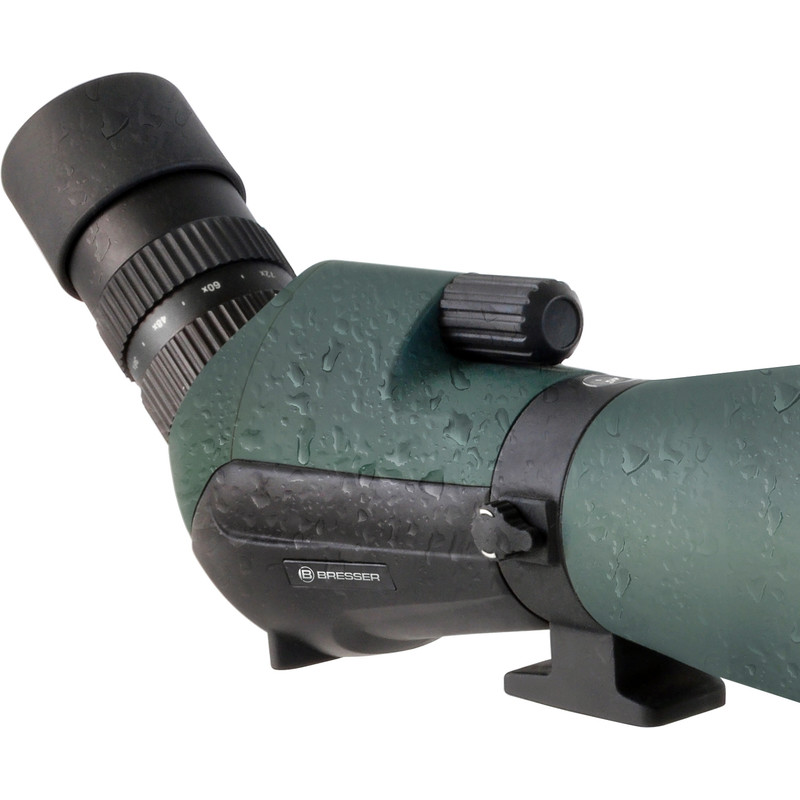 The waterproof body of the spotting scope is via tube clamp with tripod adapter plate rotatable by 240 degrees. Thus, uncommon observation positions are possible. The extendible lens cap serves as dew protection for the objective lens as well as protection against lateral sun exposure (glare protection). An universal bag made of durable nylon fabric with shoulder straps are included in the scope of delivery of the BRESSER Condor. On observations, the bag doesn't have to be removed, because the most important sections (view, objective lens, focus adjustment and tripod connection) can be opened separately. Through this, the spotting scope is optimally protected outdoors.The spotting scope can be mounted on all customarsy (photo) tripods with DIN connection thread.