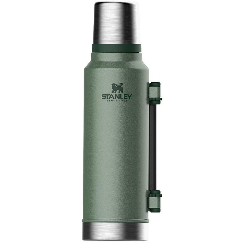 The Stanley Classic vacuum bottle is made of 18/8 stainless steel and has a protective green hammered finish. The double-walled vacuum insulation keeps drinks hot or cold for many hours. The plastic carrying handle on the side ensures easy transport of the bottle. A drinking cup, which is also insulated, sits over the bottle cap. The wide opening makes the bottle very easy to clean.