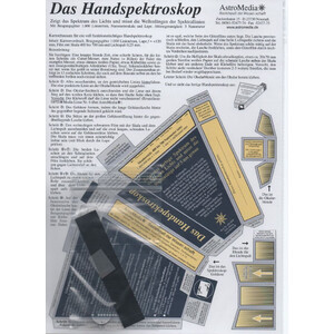 In this easy-to-build instrument, a high-precision transmitted light diffraction grating with 1,000 lines per mm reveals the spectral colours, enabling the investigation of different types of light, from the continuous spectrum of incandescent bodies such as the sun or a light bulb to the line spectra of fluorescent lamps, among other things. The wavelength can be read to an accuracy of approx. 5 nanometres on a brightness-adjustable scale.