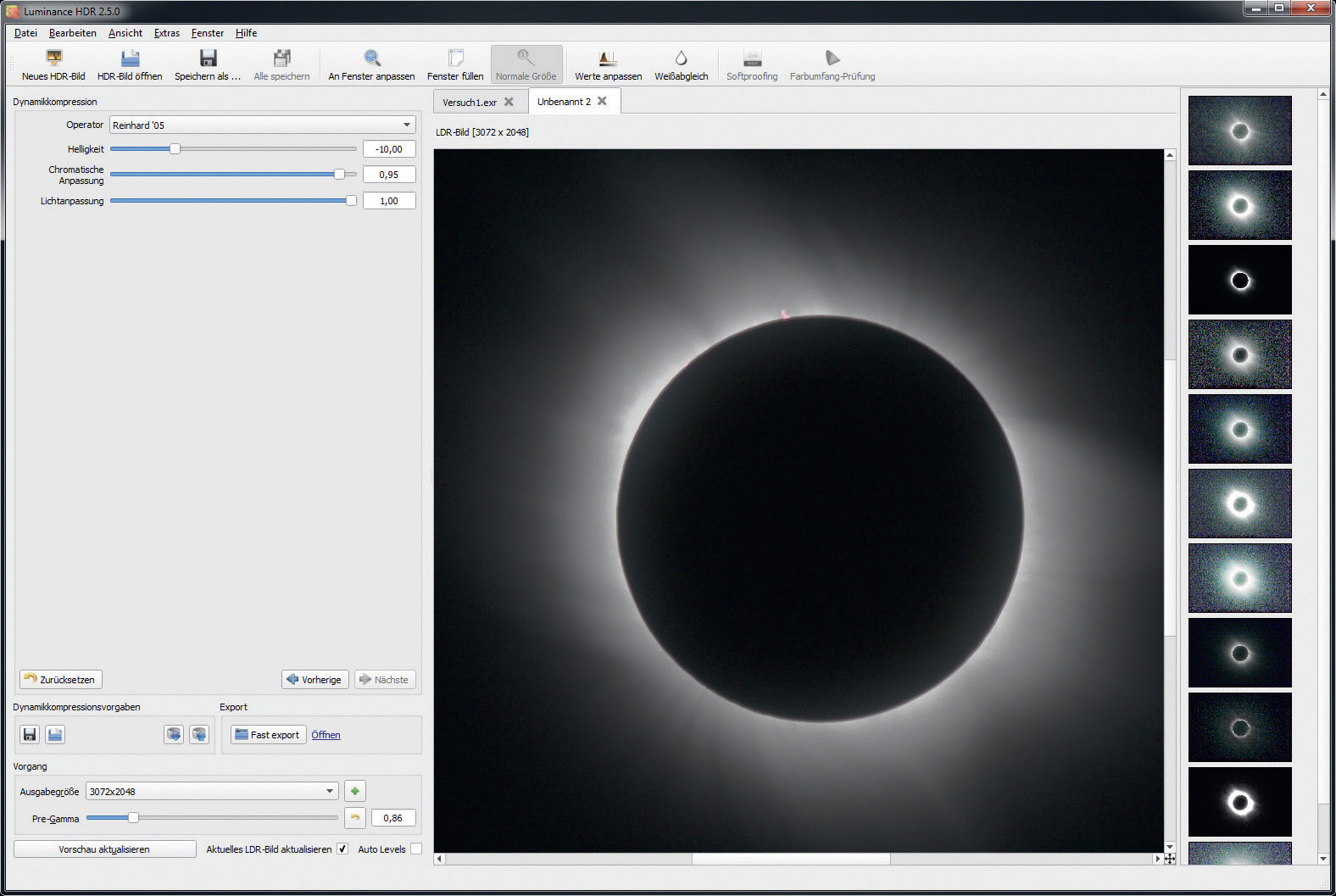 Luminance HDR, which can be downloaded free of charge, is a suitable program for processing such a series of images. The work sequence consists of two phases, which are described below.