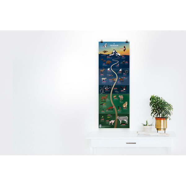 32 different Alpine animals on one poster - from A as in Alpine cough to Y as in yellow-bellied toad, from the tiny glacier flea to the mighty brown bear, from the Tyrol Grey in heights of less than 2,000 meters to the golden eagle and bearded vulture in the highest regions of the Alps.