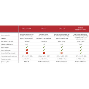 Please note: EAGLE is supplied without any cables, as it will be tailored to your system. Look for the appropriate cables under "Recommended Accessories" or let us know your components (mount, power supply, camera, guiding camera). The price for these cables is not included in the price of EAGLE.
