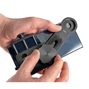 The SMARTOSCOPE VARIO II adaptor can accommodate most smartphone models of all brands, even if the phone is still in a dust cover. Large and small smartphones are attached to the adaptor with an adjustable clamp mount.