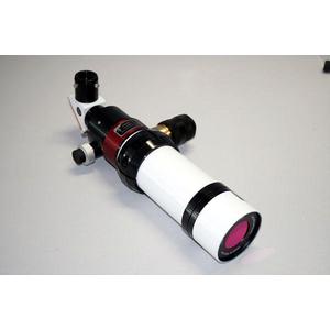 This complete solar telescope is a high-quality achromat, with the front lens reducing stray light to half that of a standard achromatic objective. This eliminates possible coma, astigmatism, centering deviations and, together with the appropriate collimation lenses, makes a spherically-corrected flat-field solar telescope. The image is optimized for maximum sharpness in the red part of the spectrum. The optical system is shadow-free (no central obstruction) and is suitable for observing the Sun's surface, as well as for prominences. The tube is made of metal and has been painted white.