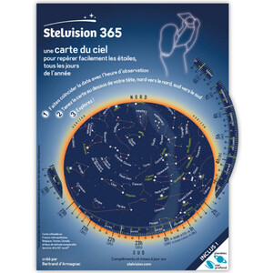 C’est un guide de base pour explorer facilement le ciel : sous un format pratique (dépliant cartonné double-A4), la carte-guide du ciel Stelvision 365 comprend une carte générale du ciel et trois pages de guide vers les principales merveilles célestes.