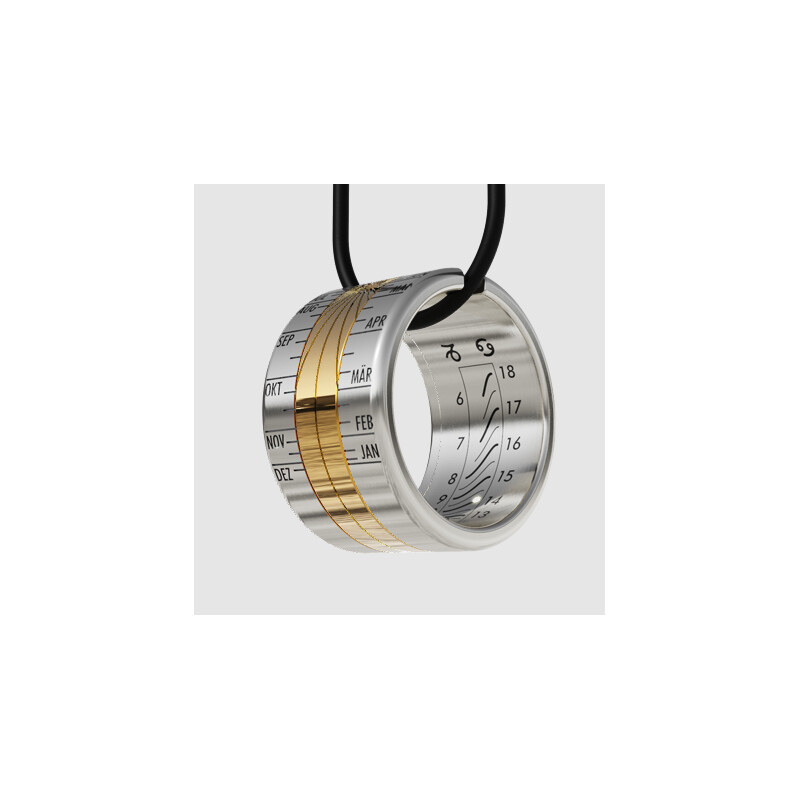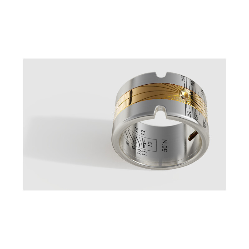 The new HELIOS Solar Ring I is an homage to its historical role model, perfection in functionality and design. And even more, the sundial is a piece of jewellery which can be worn either around your neck on the rubber strap or on your finger. The sundial displays true solar time, also called local apparent time (LAT). The Latitude is 50°N. The model is made of brushed stainless steel with a rotatable polished stainless steel or gold-plated or 18kt real gold aperture ring. Laser-engraved date scale and hour scale.