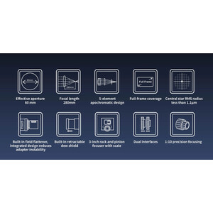 - Native flat-field: Achieves full-frame field correction with no vignetting, no distortion, and round pinpoint sharp stars