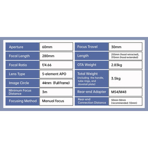 - Suitable for deep-sky, lunar and solar photography (latter only with suitable solar filter!)