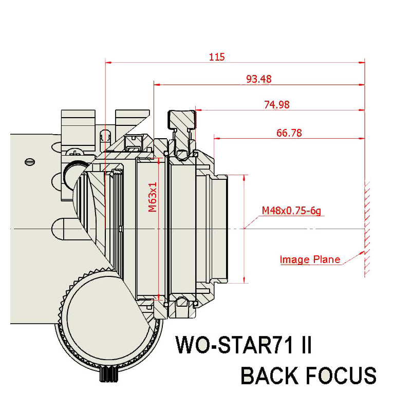 The 2.5" focuser with 1:10 reduction and 35 mm focus travel is equipped with an M48 thread. This offers numerous connection options for cameras. For example, a single-lens reflex camera (DSLR) can be connected directly using a bayonet adaptor with M48 thread. Since the correction optics are already integrated into the optical system of the Star 71, there are no problems with optical path lengths, as is otherwise the case when using an external flattener.